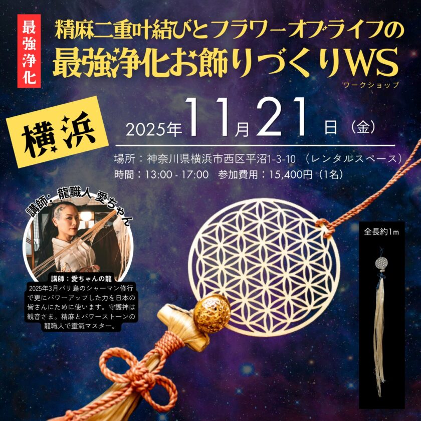「精麻”二重叶結び”と”フラワーオブライフ”の最強浄化お飾りづくり」ワークショップです。